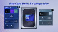 Coreシリーズ3は、既存の「Core Ultraシリーズ3」(Panther Lake)をベースに構築されたプロセッサ。米国国内で開発/製造された最先端プロセスのIntel 18Aで製造される。Intel初のハイブリッドAI対応Coreシリーズだとしており、プラットフォーム全体で最大40TOPSの性能を発揮できる。Pコアは最大2基、低電力Eコアは最大4基。2026年のCESでサイレント発表されたが、この際はSKUといった詳細が明らかになっていなかった。
