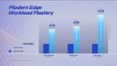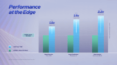 AIアクセラレーションを駆使し、エッジにおけるビジョンや音声のAI処理も実現。NVIDIAのJetson Orin Nanoと比較して、Core 7 350は物体検出性能が最大1.5倍、画像分類が最大1.9倍、ビデオ分析性能が最大2.2倍高速だとしている。