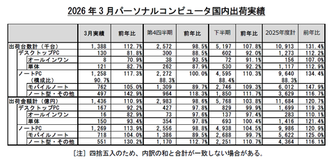 また、出荷金額は同10.9%増の1,436億円となり、こちらは過去最高を更新した。JEITAでは、「2026年3月は、個人向け、企業向けともに好調で、台数、金額とも前年を上回っている」としている。