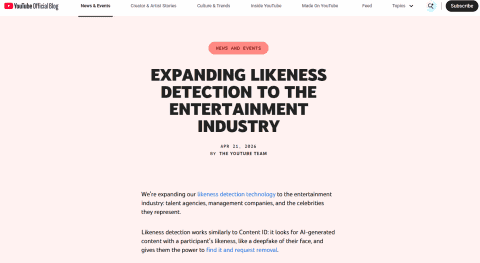 YouTubeは4月21日、動画からディープフェイクを検出する「類似性検出技術(Likeness detection)」の適用対象にエンターテインメント業界を加えると発表した。