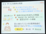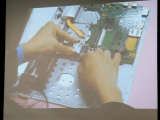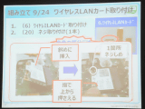 最後に、実際の組み立ての様子を披露。普段は事務をしていてPC内部のことはほとんど知らないという女性社員が、手首にアースバンドを着け、ACアダプタのDCケーブル、無線LANカードの取り付けを行なった。PC内部を見たのは「昨日が初めて」ということだが、講師の説明通りに進めきちんと取り付けられた。手順の説明書は島根富士通のパソコン組み立て教室で使われたプレゼンをベースにしたものとみられ、分かりやすく図解されているほか、要所でパーツの解説が加えられている。