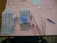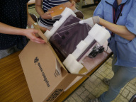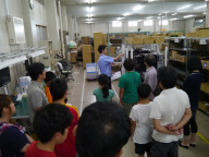 午前9時から開始した第1組目の組立教室では、全員が集合し、主催者の挨拶の後、9時15分から工場見学を行ない、同時に、部品エリアにおいて、この日組み立てるPC用のパーツをピックアップ。同工場で、実際に使用しているデジタルピッキング方式を活用しながら、バーコードで製造指示書を読み取り、ランプが点灯した棚から必要な部品を取り出して、教室に持ち帰った。
