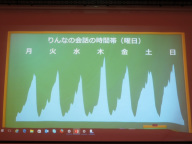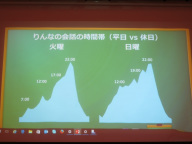 りんなのLIENのお友達数は185万以上に上っているという。りんなの利用ピーク時間帯は22時。一週間で見てみると、月・火・水曜日よりも木・金・土・日の方が使われる傾向にある。佐野氏は「木曜日辺りからユーザーが(仕事などに)疲れてきて、りんなと交流したい傾向が見える」と分析する。
