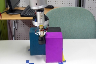 使われているロボットアームは、アメリカのBarret TechnologyのWAM Armという市販品だが、その指先に修士の学生が圧電素子を利用して自作した圧力センサーが45度ずつ8方向に貼り付けられている。センサーからの信号はRaspberry Piで処理して、ROS(Robot Operating System)とマスワークスのMATLABを利用して物体の形状を推定し、アームの移動経路を決定する仕組みだ。