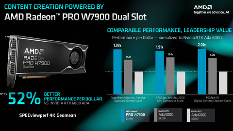 コストパフォーマンスの高さが強みだとしており、1ドルあたりの性能を比較すると、競合製品であるNVIDIA RTX Ada 5000(米国価格4,000ドル)と比べると約2倍、上位のNVIDIA RTX Ada 6000(6,800ドル)と比べても最大52%優れているという。