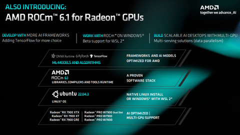 あわせて、Radeon GPU向けソフトウェアスタックの最新版となる「ROCm 6.1」も6月19日より提供を開始すると発表。TensorFlowのサポートにより、多くのAIフレームワーク向けの開発が可能になったほか、WSL2のベータサポート、マルチGPU環境への対応などが実施される。
