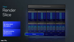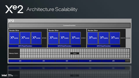 Xe2アーキテクチャでの拡張はそうした演算エンジンだけにとどまらない。CPUで言うところのフロントエンド、バックエンドに相当するようなスケジューラ(Command)、ジオメトリエンジンは命令フェッチのスループットが3倍になったほか、L1キャッシュやL2キャッシュなどのバックエンドの性能も強化され、L2キャッシュは8MBに強化されている。また、ハードウェアリアルタイムレイトレーシング(Intel RTU)も引き続き搭載されている。