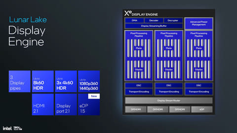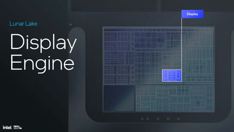 Lunar Lakeでは、ディスプレイエンジンも強化されている。これまでCore Ultraの時はSoCタイルの中に配置されていたが、Lunar LakeではSoCタイルはコンピュートタイルに統合されているため、コンピュートタイル上に置かれている。3パイプ(3つの画面に出力が可能)で最大8k60pのHDRないしは3×4K60pといった仕様は同じで、HDMI 2.1、DisplayPort 2.1に対応というあたりは同等だ。