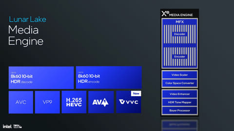 メディアエンジンは基本的にCore Ultraと同等だが、アップデートとしてH.266/VVC(Versatile Video Coding)という新コーデックに対応した。これは、ストリーミングビデオのデータ量を減らすために開発されたコーデックで、AV1と比較して10%程度ファイルサイズを減らせるものだ。