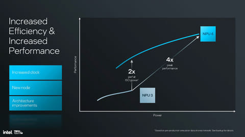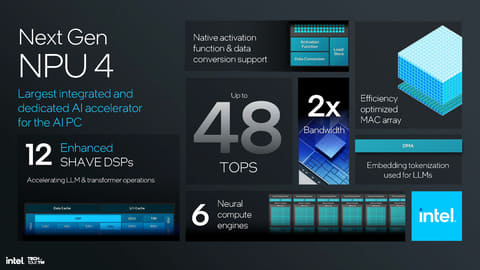 MACとDSPがそれぞれ増えていることで、従来のNPU3では11TOPS(これまでIntelは11TOPSと説明してきたが、今回正確には11.5TOPSであることが公開された。ただ従来通り11TOPSと表現しておく)から4倍以上となる48TOPSを実現したことになる。