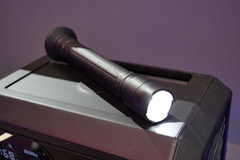 もしかして、本当に取っ手を持って振り回せたりするのかと思ったのだが、取っ手を握ると簡単に取れてしまう。実はこの取っ手は懐中電灯となっていて、側面スイッチを入れると先端が明るく輝くようになっている。また、底面は本体側にマグネットで装着できるが、その本体側の装着部はQi2準拠の充電パッドが埋め込まれており、この懐中電灯を充電したり、Qi/Qi2対応スマホの充電が可能。