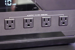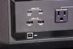 正面には、最大100W出力と最大65W出力のUSB Type-C、最大18WのUSB Type-A×2と4ポートのUSB電源ポートを用意。また110~120V、トータル最大1,200WのAC電源も4ポート備えており、ROG Ally XのようなポータブルゲーミングPCやスマホの充電はもちろん、ゲーミングPCとディスプレイの駆動も余裕で可能だ。