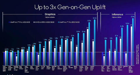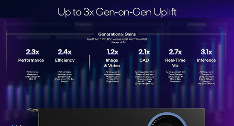 Intelが公開したデータによれば、前世代のIntel Arc Pro A50(6GB)と、今回発表されたIntel Arc Pro B50(16GB)を比較した場合、性能では最大3倍の向上が見込め、平均すると性能では2.3倍、電力効率では2.4倍の改善が期待できるという。