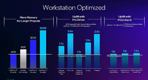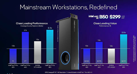 競合他社との比較では、「NVIDIA RTX A1000」(8GB、Intelの調査では市場価格が409ドル)との比較では性能では上回っており、かつ価格はB50が299ドルと、むしろ安くなっており、価格性能比が高いとIntelはアピールしている。