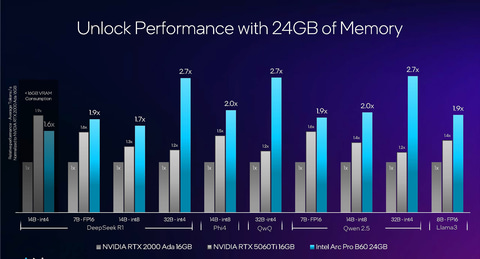 B60と、競合他社製品となるNVIDIA RTX 2000 Ada 16GB、NVIDIA GeForce RTX 5060 Ti 16GBとで比較すると、メモリ16GBを使い切れないLLMでは、NVIDIA側の性能が高くなるものの、負荷が高いパラメータ数が多いLLMではメモリの制限がくることで、24GBメモリを搭載しているB60が上回ると説明している。なお、IntelはB60の価格に関しては現時点では何も言及していない。