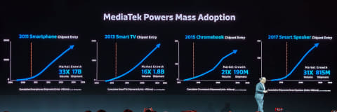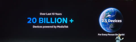 MediaTekは1997年に、UMC(United Microelectronics Corporation)がファウンドリビジネスに特化するにあたり、製品部門がスピンアウトする形で設立された半導体メーカー。当初は光学ドライブのコントローラなどが主力事業だったが、後にデジタルTV向けのSoC、普及価格帯のスマートフォン向けSoCなどの事業に進出し、現在はファブレスの半導体メーカーとしてはグローバルに5位の規模となる半導体メーカーになっている。ツァイ氏は「我々の製品は既に200億台を超える機器に採用されている。これは全世界で一人あたりが2.5台の製品を採用したデバイスを持っている計算になる」と、アピールした。