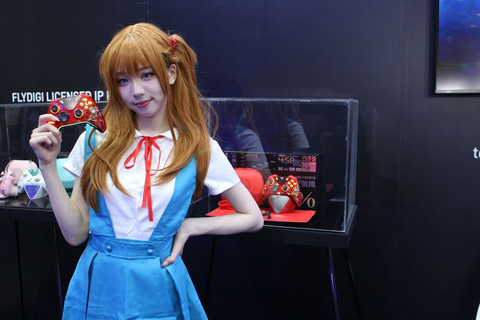 エヴァ2号機デザインのノートPCクーラーやスマホクーラーなども展示されていたが、これらの国内販売は未定。そのほか、国内未発売デザインのコントローラやアクセサリが多数展示されていた。