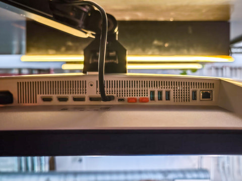 PCとの接続に利用するUSB Type-CはThunderbolt 4に対応しており、DisplayPort Alt Modeと140WのUSB PD給電に対応している。ほかにも、2つのHDMI 2.1(HDCP 2.2対応)、2つのDisplayPort 1.4(HDCP 2.2対応)の入力を備えており、USB Type-Cの入力と合わせて最大4台までのPCを接続して、KVM的な使い方も可能になっている。