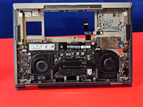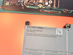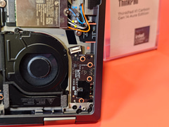 さらに、右側のThunderbolt 4はドーターボード形式で実装されている。メインのPCBとドーターボードは、キーボードの下という非常に限られたスペースを通るフレキケーブルで実現されるという、まるで3D方向を上手に使ったデザインになっているのが大きな特徴といえる。