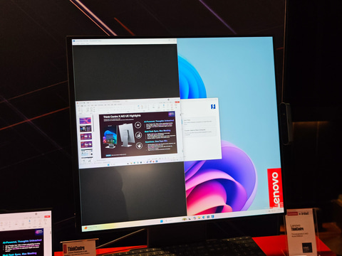 ThinkCentre X AIOは、27.6型QHD(2,560×2,880ドット300cd/平方m)のIPS液晶を内蔵。通常一体型PCのパネルは横向き固定だが、ThinkCentre X AIOはパネル部を回転させられる。