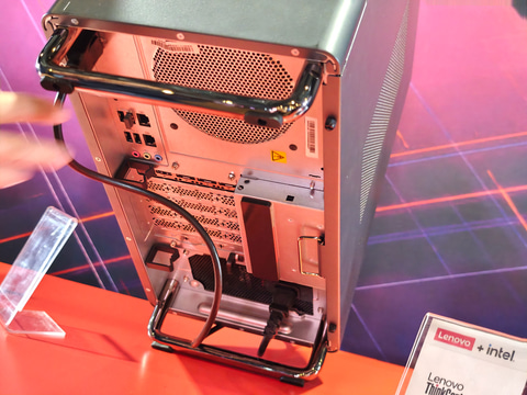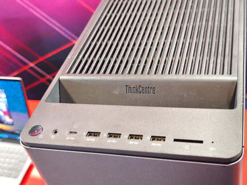 ThinkCentre X Towerはミニタワー型のワークステーションPCで、最大で2枚の拡張カードを内蔵できる。実機で確認したところ、正確には本体の構造としては4スロット分が用意されており、2スロットのGPUが2枚となる。AIアプリケーションやAIモデルの開発向けのワークステーションとなる。