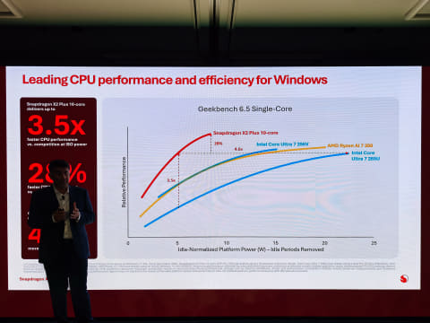 コンダップ氏は「従来世代に比べてシングルスレッドが35%、マルチスレッドが17%向上する。競合メーカーのCore Ultra 7 265Uと比較すると同じ性能であれば電力効率が4.5倍優れており、同じ電力であれば性能は3.5倍になる」と述べ、高い性能をアピールした。