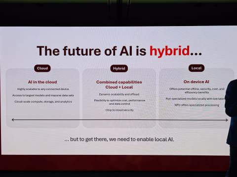 そのため重要になってくるのがハイブリッドAIと呼ばれる、クラウドとローカルのプロセッサが協調して動作する形のAIで、それを実現していくための第一歩としてNPUをローカルに装着してもらう取り組みを行なっていると述べた。