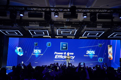 ジョンソン氏は「Core Ultraシリーズ3のコンピュートタイルはIntel 18Aを利用して製造されている。Intel 18AはRibbonFET、PowerViaという革新的なプロセスノードの新機能を2つ同時に採用しており、電力効率で15%、チップの密度で30%前世代より向上している」と述べ、Intel 18Aの新しい機能であるRibbonFET(GAAと呼ばれる4D的な構造のゲートのこと)とPowerVia(裏面供給電力)の2つが性能向上の鍵になっていると強調した。