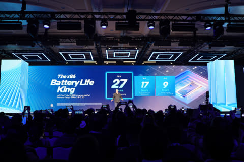 これにより、従来製品Core Ultra 9 288VとCore Ultra X9 388Hを比較すると、同じ電力であれば60%性能が向上し、Coreシリーズ1(Core 7 150U、Raptor Lake Refresh)との比較では、消費電力が2.8倍少なくなっているとジョンソン氏は説明した。それによりCore Ultra X9 388H、2.8K OLEDパネル、99Whのバッテリを搭載したLenovoのIdeaPadを利用したベンチマークでは27時間のバッテリ駆動時が可能になると強調し、Core Ultraシリーズ2に引き続き長時間バッテリ駆動が特徴だと強調した。