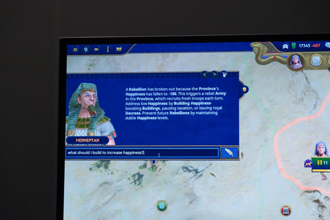 また、自律的なAIアバターを実現するNVIDIA ACEをゲームに適用したデモも行なわれていた。「Total War: PHARAOH」の例では、NVIDIA ACEを使ったAIアドバイザーがゲーム内に出現。ゲーム内の情報を読み取りながら、ゲームプレイをアシストする様子が実演された。