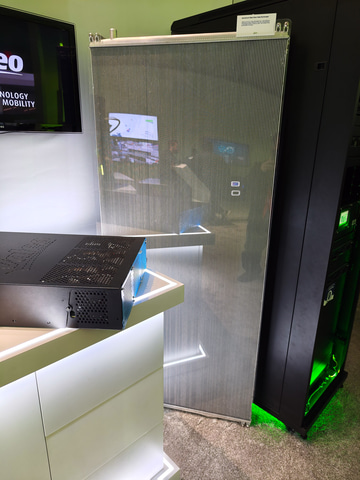自動車向けのティア1部品メーカーである仏ヴァレオは、データセンター向けの液冷ソリューションを展示した。展示したのはCDU(Cooling Distribution Unit)と呼ばれる、3Uの液冷用の冷却ユニットで、内部にポンプなどを内蔵しておりGPUのヒートシンクから液に熱が伝導され、その熱を冷やすラジエターの役割を担っている。