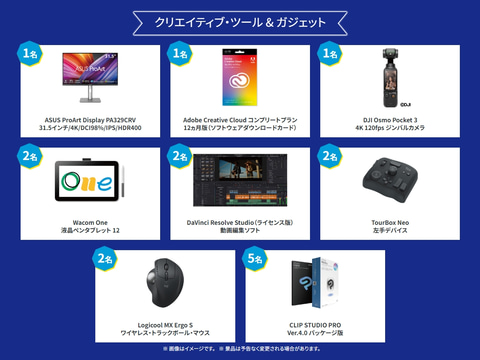 応募者には抽選で、ASUS ProArt Display PA329CRVやWacom Oneなど計16名に豪華景品が当たる。