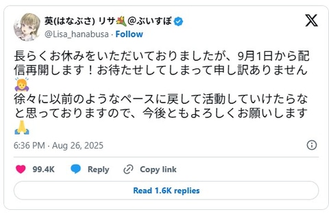— 英(はなぶさ) リサ💐@ぶいすぽ (@Lisa_hanabusa)August 26, 2025