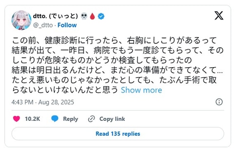 eスポーツチームREJECT所属のdtto.さんは8月28日、自身のX(旧Twitter)において、健康診断で胸のしこりが発見されたことを報告した。