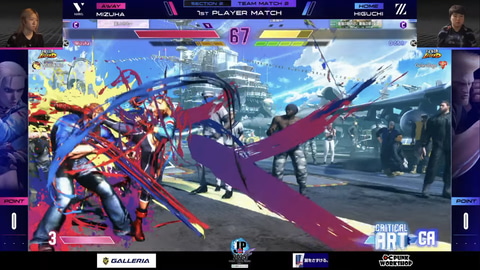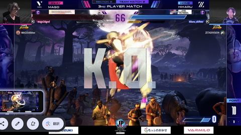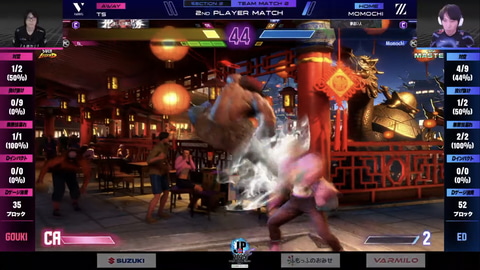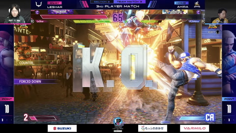 先鋒戦はひぐちのガイルと水派のキャミィの1戦。ギリギリの接戦となったが、水派のキャミィが2-1で勝利し、VARRELが10-0で先取した。中堅戦はももちのエドとtsの豪鬼の1戦で、ここはももちのエドがtsの豪鬼の強気な攻めを抑え切り、2-0で勝利。ZETA DIVSION Geeklyが10-10で追いつき、大将戦で勝敗が決する展開となった。
