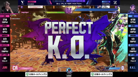 大将戦はひかるのA.K.I.とマゴのジュリの1戦。初戦はマゴのジュリの動きがよく1本を先制。ところが2セット目からひかるがギリギリのところで勝ちを取っていく展開で2本連取でリーチをかける。4セット目はマゴが取り返して2-2のフルセット。最終セットはフルセットフルラウンドでひかるのA.K.I.が見事な読みで逆転を許さず勝利を決めて3-2で大将戦を制した。この大将戦のひかるの勝利により、ZETA DIVSION Geeklyが30-10でVARREL相手に勝利した。