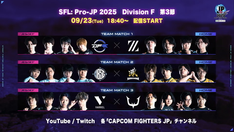 9月9日、「ストリートファイターリーグ: Pro-JP 2025(以下、SFL2025)」のF Divisionの第2節が行なわれた。1節で初戦勝利を飾るなど好調だったVARRELがF Division強豪のZETA DIVISION Geeklyと対戦するほか、初戦勝利の好スタートとなったREJECTが、あでりいの大将戦の活躍が華々しかった広島TEAM iXAと対戦。さらには因縁含みのヤナイとGO1の激突はあるのかが注目のFUKUSHIMA IBUSHIGINとDetonatioN Focus Meによる1戦と、本日も見どころたっぷりだ。