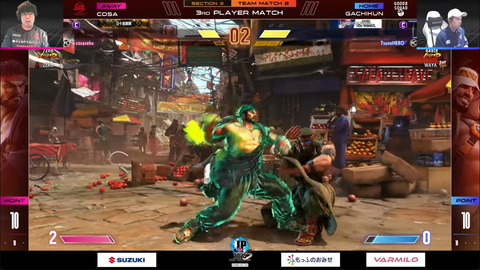 続く中堅戦はぷげらのベガとまちゃぼーのリュウの1戦。サガットを出すと思わせてのベガピックだったが、まちゃぼーのリュウの立ち回りが見事でここは2-0でぷげらのベガ相手に完封勝利。Saishunkan Sol 熊本が10-10で追いつく展開となった。