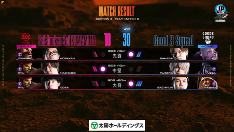 大将戦はガチくんのラシードとcosaのリュウの一戦。1セット目は時間いっぱいの激闘をcosaがギリギリで制して先制するも、2セット目はガチくんラシードの立ち回りがよく、取り返す。cosaは早々にインターバルを取るが、続く3セット目もガチくんラシードのリュウ対策が見事に刺さり、連勝でリーチ、4セット目はcosaのリュウが慎重な立ち回りを見せるも、ガチくんラシードの猛追を防げず、そのまま3連勝を決めたガチくんラシードが3-1で勝利。結果、Good 8 Squadが30-10でSaishunkan Sol 熊本に勝利することとなった。