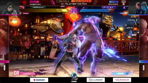 先鋒戦はさはらのエドとこばやんのザンギエフの一戦。元々エドとザンギエフでは、ザンギエフが不利なマッチングだが、そんな中で1セットを取るなど、こばやんのザンギエフも善戦したが、やはりさはらのエドが堅実な立ち回りで2-1の勝利。Good 8 Squadが10-0で先制した。