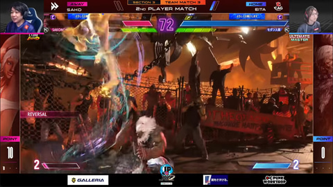 先鋒戦はKEI.Bの舞とボンちゃんのサガットの1戦。オフラインの環境の中で万全なサガット対策を見せたKEI.Bが2-0勝利で名古屋NTPOJAが10-0で先制となった。