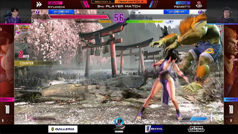 続く中堅戦、えいたの豪鬼とsakoのエレナの1戦は、えいたの豪鬼が万全のエレナ対策を見せ、2セット目はダブルパーフェクトで2-0勝利となり、CAG OSAKAが10-10で追いつく展開となった。