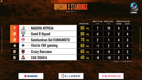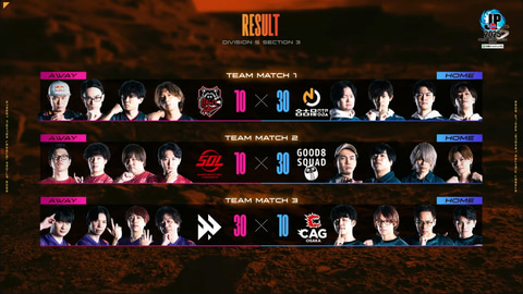 第3節を終えて、S Divisionは上位が入れ替わり、この日勝利したGood 8 Squadと名古屋NTPOJAが1位、2位に上がり、前節まで1位のSaishunkan Sol 熊本が3位となった。残る7節でこのチーム位置がどう入れ替わっていくのか、今後の展開にも注目していきたい。