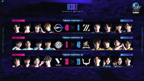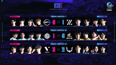 第3節を終えて、F Divisionは上位が入れ替わり、本日40-0で勝利してポイントを大きく伸ばした広島TEAM iXAが4位から一気にトップに躍り出た。また、DetonatioN FocusMeは6位から4位にポイントを伸ばす展開に。REJECTは負けはしたが2位に留まり、逆にVARRELは勝利したにも関わらず、広島TEAM iXAの伸びの影響で3位に順位を落とす珍事となった。