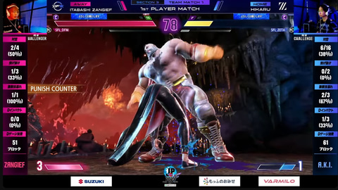 先鋒戦はひかるのA.K.I.と板橋ザンギエフのザンギエフによる1戦。オフラインの環境の中で1セット目は順当に勝ちを取ったひかるのA.K.I.だったが、2セット目から板橋ザンギエフの反撃が開始し、2セット目を取り返す。1-1で迎えた3セット目もラウンドを取られながら、そこから逆転劇を決めて、板橋ザンギエフが見事2-1でひかるのA.K.I.を撃破!DetonatioN FocusMeが10-0で先制する流れとなった。