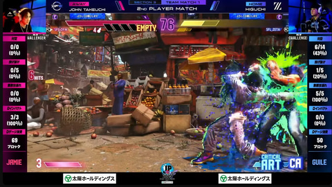 MATCH1は、ホームがZETA DIVISION Geekly、アウェイがDetonatioN FocusMeの1戦。アウェイ側のオーダーは、先鋒が板橋ザンギエフのザンギエフ、中堅が竹内ジョンのジェイミー、大将がGO1のキャミィ、リザーブはナウマンの舞。対するホーム側、ZETA DIVISION Geeklyは、先鋒がひかるのA.K.I.、中堅はひぐちのガイル、大将はももちのエド、リザーブは翔だが、今回は欠場となっている。
