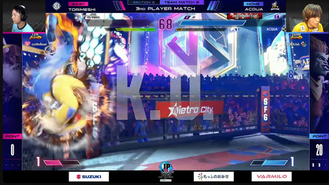 大将戦はここまで無敗を突き進む鶏めしのダルシムとACQUAのブランカの1戦。一般的にはダルシムとブランカでは、キャラクター相性はブランカのほうが有利だが、一方で鶏めしのダルシムについては、過去2戦とも不利対面を克服してきた経緯もあり注目の1戦だったが、試合が開始すると、ACQUAのブランカが試合の主導権を握る展開が多く、1セットかろうじて取った鶏めしのダルシムだったが、反撃はそこまで、ACQUAのブランカが3-1で勝利し、広島TEAM iXAも40-0でFUKUSHIMA IBUSHIGINを完封して勝利する結果となり、なんとMATCH1に続いて2試合連続の完封試合が続く展開となった。