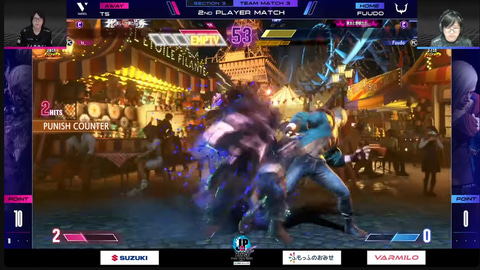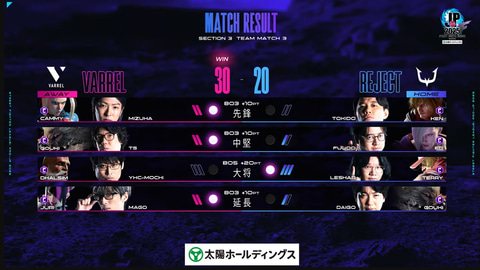 続く中堅戦、ふ~どのエドとtsの豪鬼の1戦はギリギリの接戦をtsの豪鬼が2-1で勝利し、VARRELが20-0となり、REJECTを突き放す展開となった。