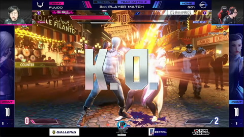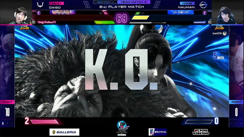 先鋒戦となる竹内ジョンのジェイミーとLeSharのエドの1戦は、LeSharのエドが2-0のストレートで勝利。続く中堅戦、ナウマンの舞とウメハラの豪鬼の1戦はナウマンの舞が2-0で勝利となり、両チーム10-10の同点。大将戦に勝敗を委ねる展開となった。