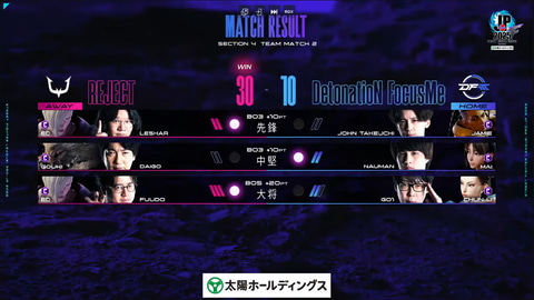 大将戦はGO1の春麗とふ~どのエドの1戦。前半はGO1の春麗が時間をじっくり使う立ち回りで圧倒し、2-0まで追い込むが、インターバルを挟んでふ~どのエドが反撃し2-2まで追いつく展開。その勢いのまま、駆け抜けるかと思いきや、GO1の春麗が粘りを見せてフルセットフルラウンドまでもつれ込んだ。激闘を最後に制したのは、ふ~どのエド。3-2で逆転勝利を決めて、REJECTが30-10でMATCH 2を勝ち取った。